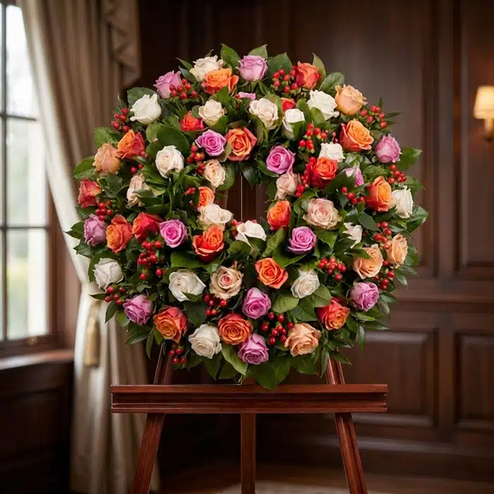 En los momentos más difíciles, cuando las palabras no son suficientes, esta corona fúnebre se convierte en un abrazo sincero. Diseñada con un delicado aro de rosas multicolores y flores frescas de temporada, cada pétalo expresa el cariño y el respeto que desea transmitir.